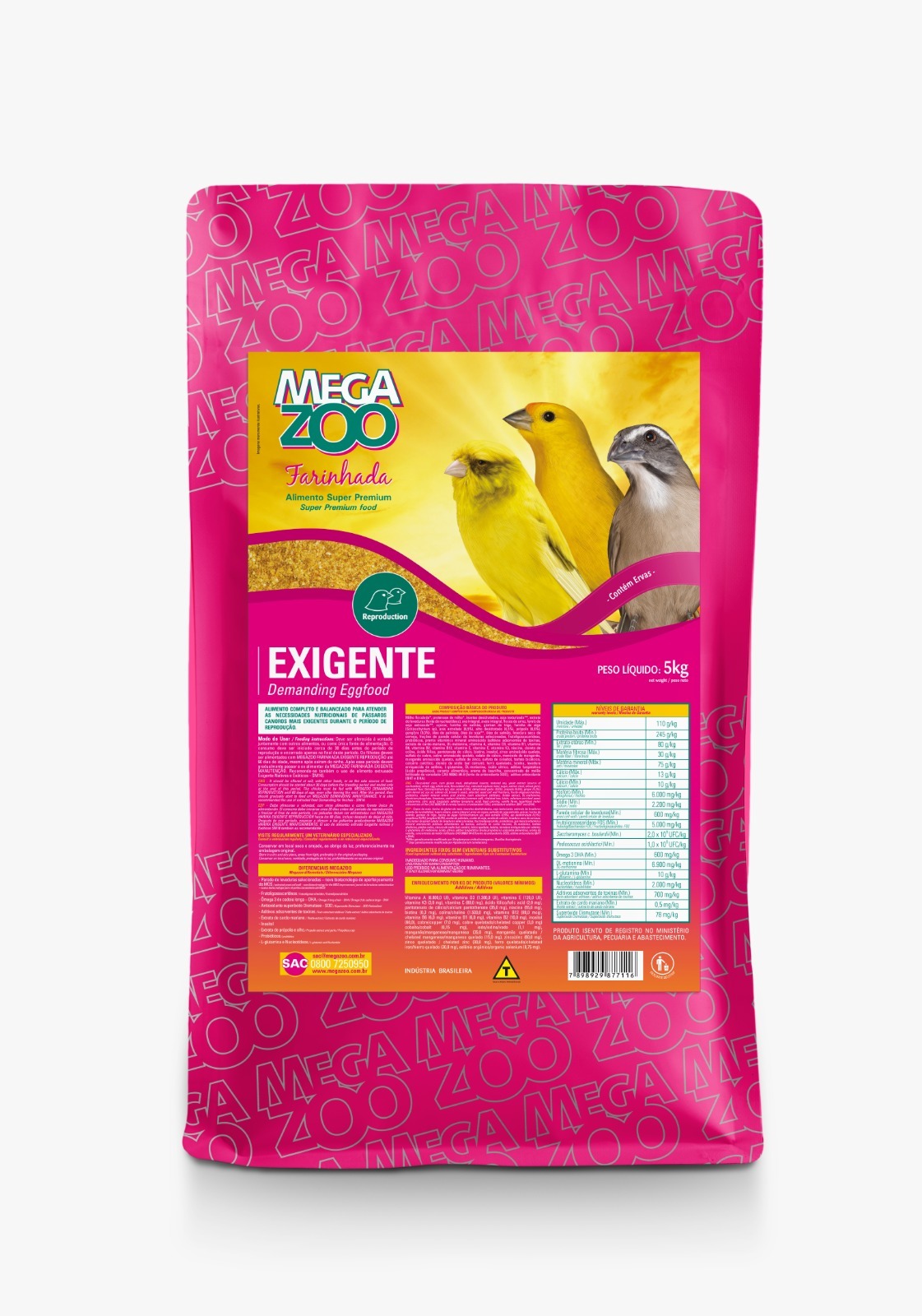 Alimento completo com alto valor biológico e todos os nutrientes necessários para atender as necessidades nutricionais de pássaros mais exigentes durante o período de reprodução. Alguns pássaros pássaros podem possuir um crescimento mais intenso que os demais sendo também bem mais sensíveis durante os primeiros meses de vida. Como consequência normalmente a taxa de mortalidade é bem maior nesses grupos. Assim, a Megazoo desenvolveu uma farinhada adequada visando preparar as aves para encarar esses desafios.